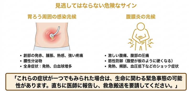 胃ろう造設部の感染や腹膜炎は、重篤な合併症の一つです。早期発見と迅速な対応が求められます。