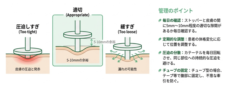 ストッパーと皮膚の間には、通常、5mmから10mm程度の余裕を持たせます。圧迫しすぎると皮膚損傷や潰瘍の原因となり、緩すぎると栄養剤の漏れや感染のリスクが高まります。