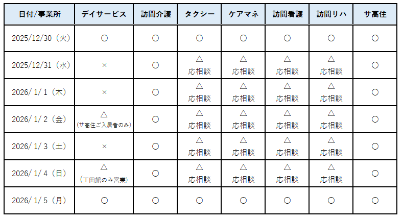 なお、サービス付き高齢者向け住宅 『グランド・ピア西尾』『グランドール西尾』『グランド・シエル西尾』『グランド・ブルーム西尾』 では只今、年末年始、短期利用(ショートステイ)のご予約を開始しております。